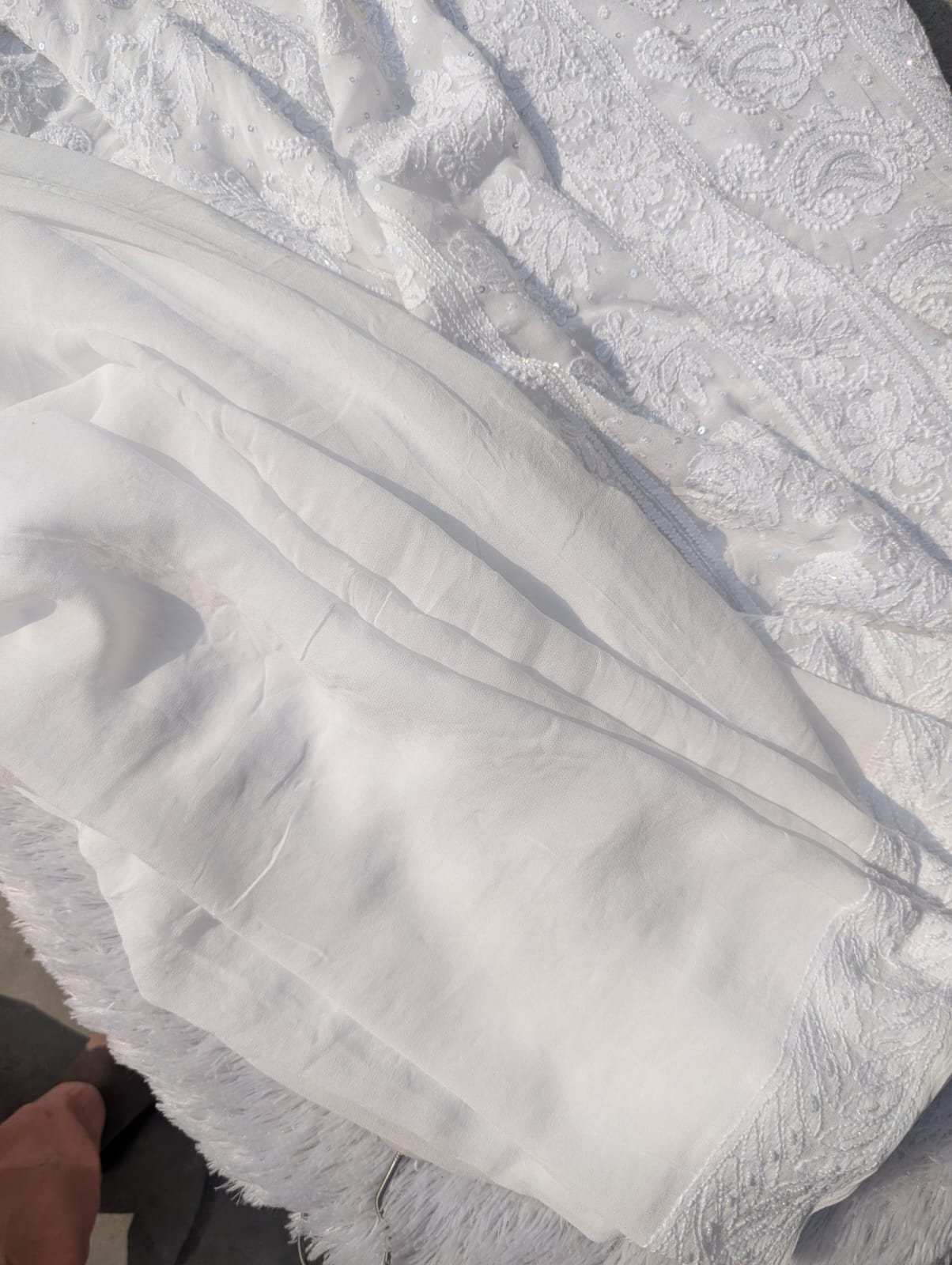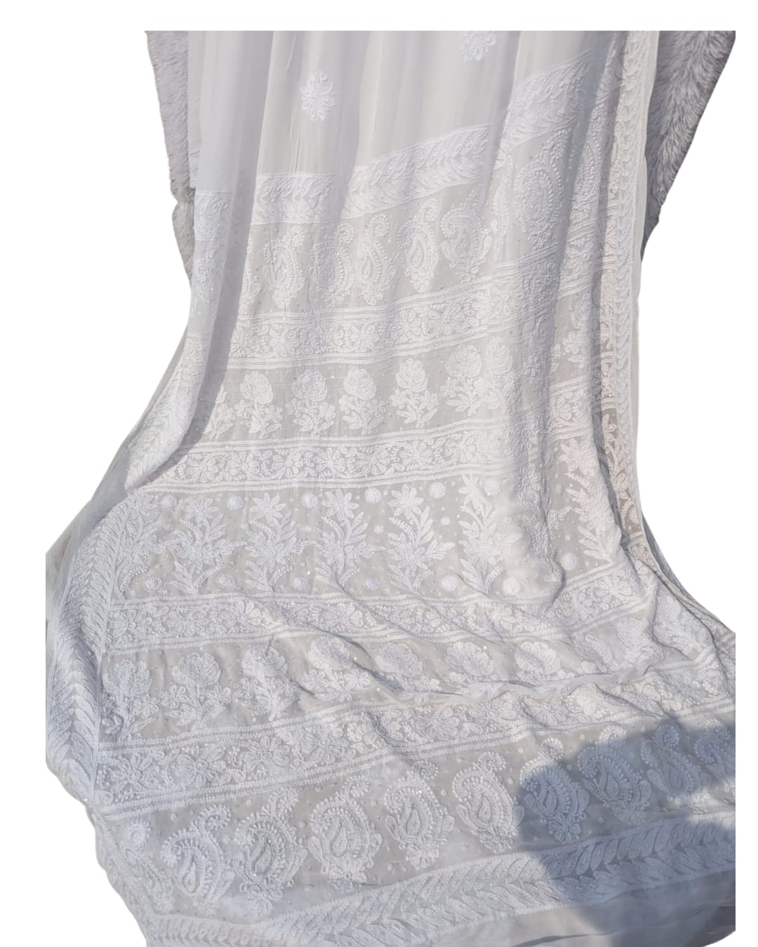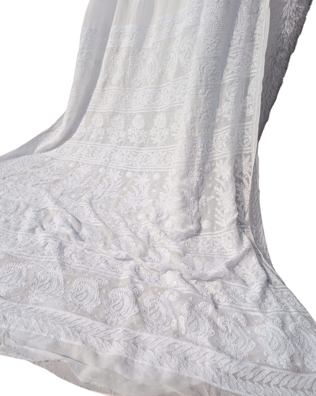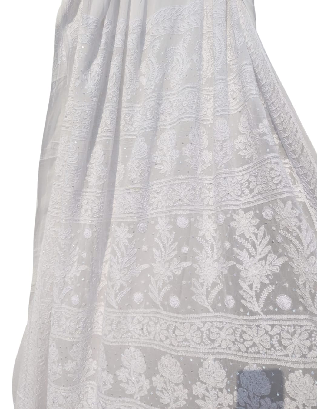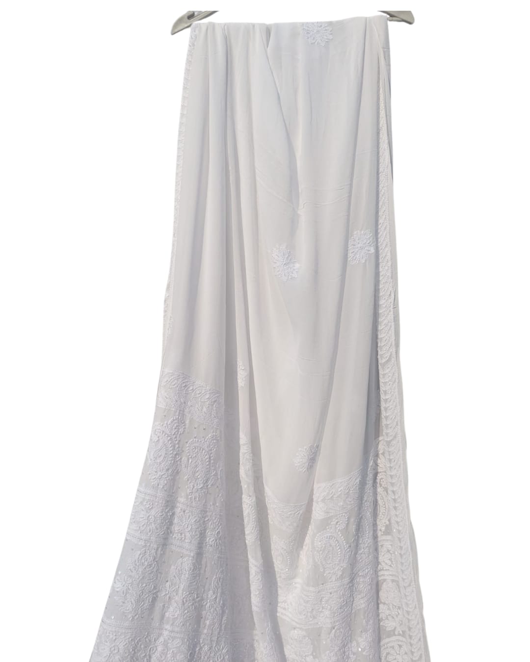 DRAPED IN THE RICHNESS OF SUBTLE WHITE CHIKANKARI AND FINISHED WITH PEARL DETAILING A MUST HAVE IN YOUR WARDROBE
